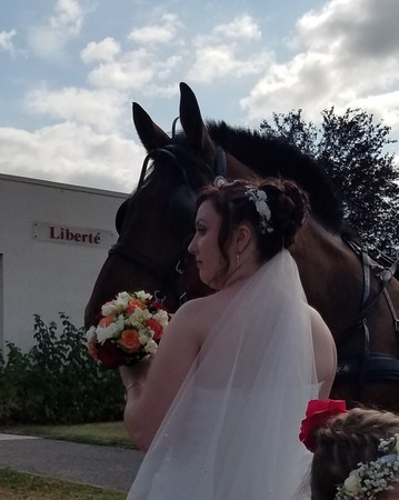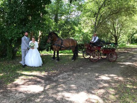 Des mariés heureux en calèche et c'est une belle journée assurée ! Nos chevaux peuvent vous accompagner jusqu'à la mairie ou à l'église comme jusqu'à la fête.