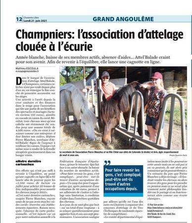 Article Charente libre du 21 Juin 2021 : "Champniers : l'association d'attelage clouée à l'écurie"